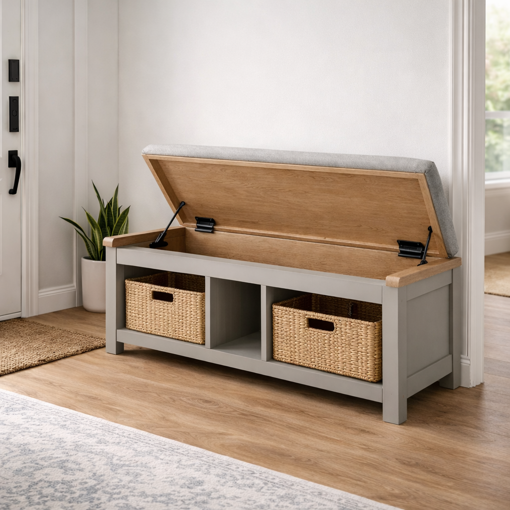 Diese Aufbewahrungsbank bietet eine praktische Kombination aus Sitzgelegenheit und Stauraum. Unter der aufklappbaren Sitzfläche befindet sich ein geräumiges Fach, in dem Decken, Kissen oder andere Alltagsgegenstände ordentlich verstaut werden können. Das stabile Design eignet sich für verschiedene Wohnbereiche wie Flur, Wohnzimmer oder Schlafzimmer und trägt zu einer aufgeräumten Atmosphäre bei.
